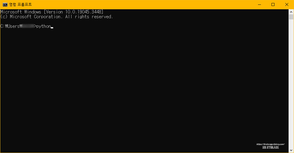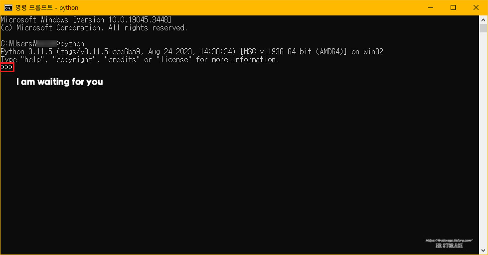 5. python이라고 입력하고 엔터를 치면 명령어를 대기하는 상태가 됩니다.