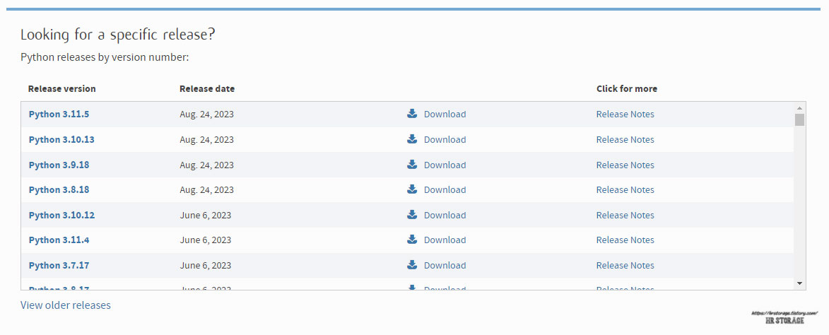 2-1. 윈도우7 이전 버전이라면, Downloads - All releases에 들어가서 3.9 이전 버전을 다운받으면 됩니다.